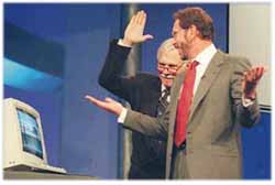 D'une part l'incompatibilité, d'autre part les problèmes internes rencontrés par APPLE, sans oublier le nombre supérieur de programmes disponibles sur PC, adaptés bien plus tard, voire jamais, sur MAC. Fort de ce constat, le fabricant taiwanais de clones Mac 'UMAX' a décidé de lancer pour la fin de l'année une carte, pouvant accueillir, soit une puce PowerPC (à l'origine des Mac actuels), soit un Pentium (puce fabriquée par Intel, qui équipe la majorité des compatibles PC), soit les deux processeurs simultanément. Avantage d'une telle option, bénéficier d'un double système d'exploitation : MACOS et Windows NT. Nobody's perfect ! |