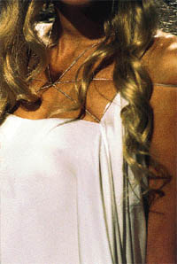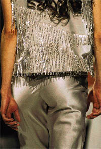 Du gris perle pour ce deux-pièces pantalon rehaussé par des chaînes de métal. |