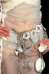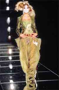 Créature étrange: le collier et la ceinture servent de support pour une bouteille de vin ou pour porter ses clés... C’est ainsi que Galliano voit les SDF! |